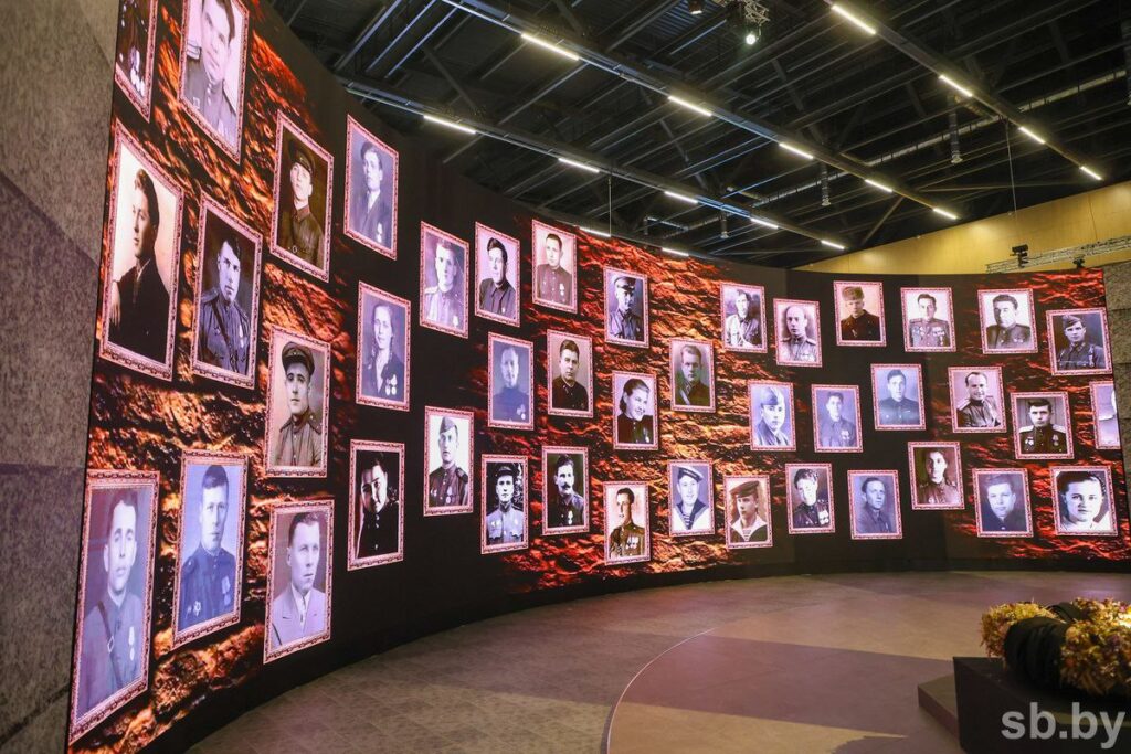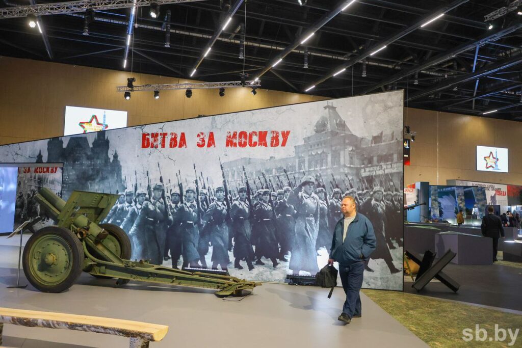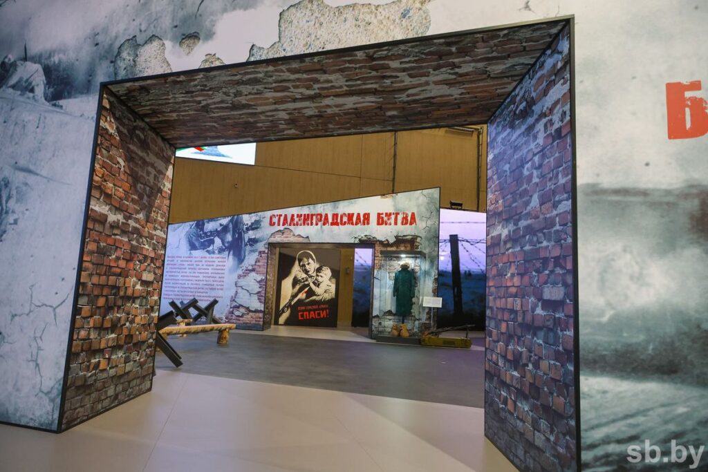 Центром экспозиции стала воссозданная площадь Победы. Вокруг нее представлены тематические блоки в хронологической последовательности.