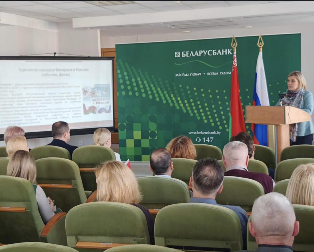 В качестве лектора перед коллективом выступила Наталья Владимировна Вологина — кандидат политических наук, доцент, проректор по учебной работе ГУВПО «Белорусско-Российский университет», представитель «Белорусского общества «Знание».