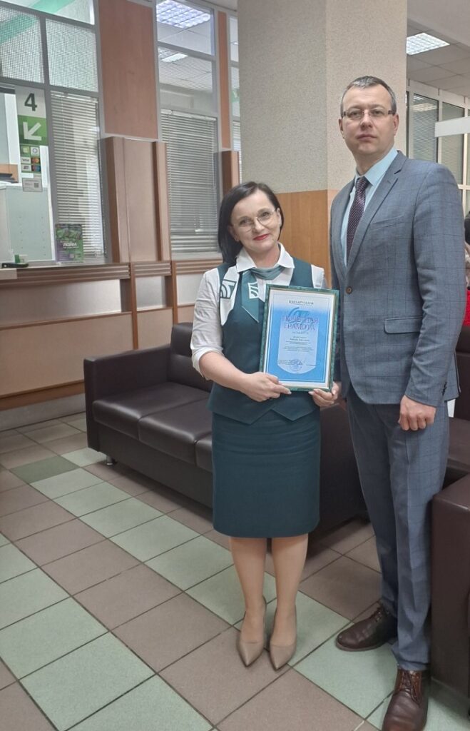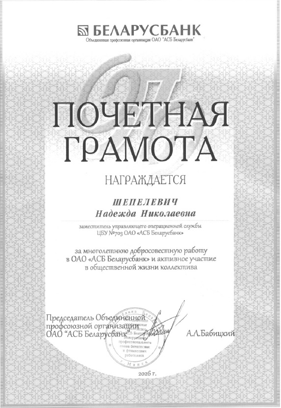 За многолетнюю добросовестную работу в ОАО «АСБ Беларусбанк» и активное участие в общественной жизни коллектива Почетной грамотой Объединенной профсоюзной организации ОАО «АСБ Беларусбанк» награждена заместитель управляющего операционной службы ЦБУ №703 Надежда Николаевна Шепелевич.